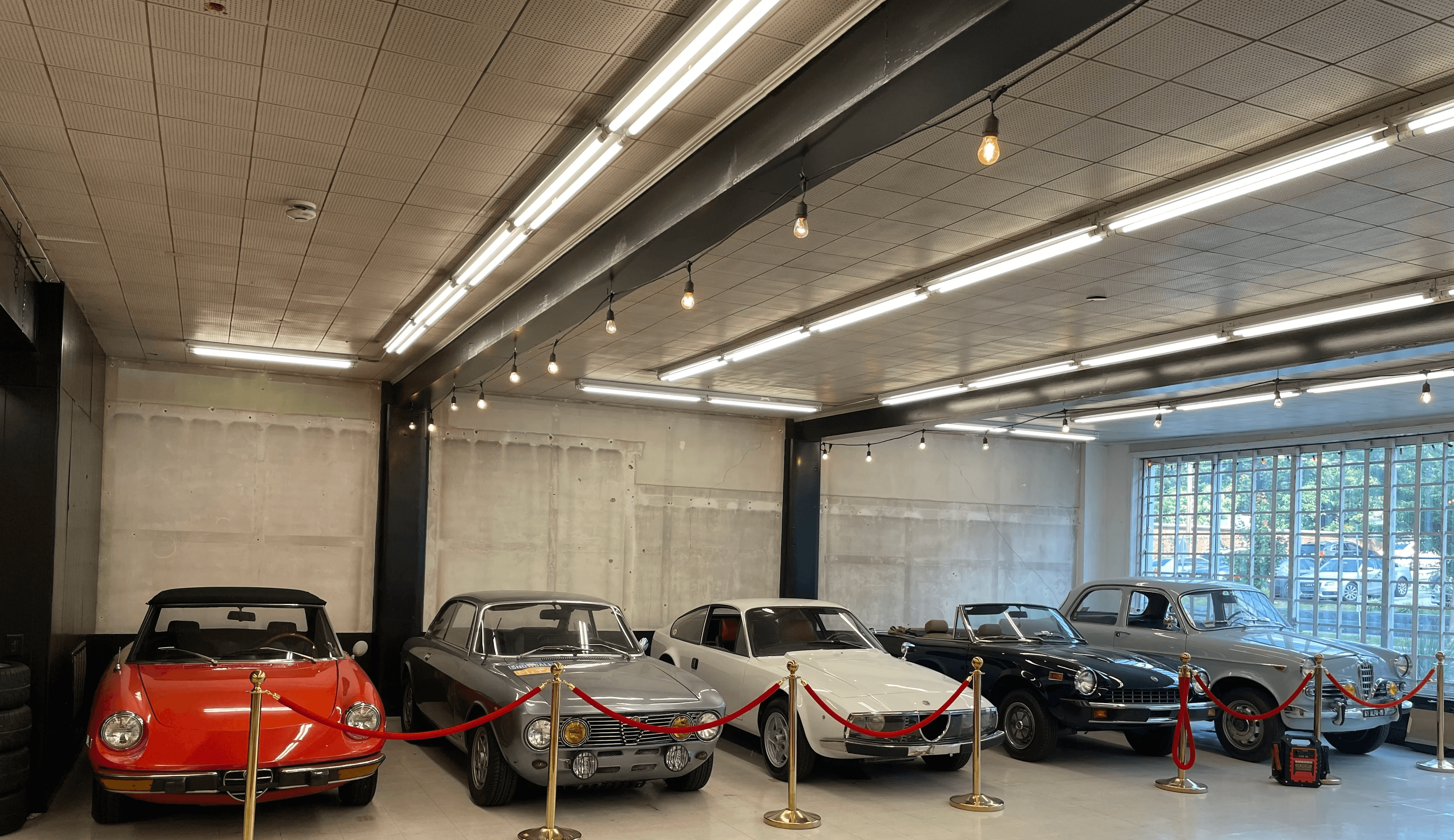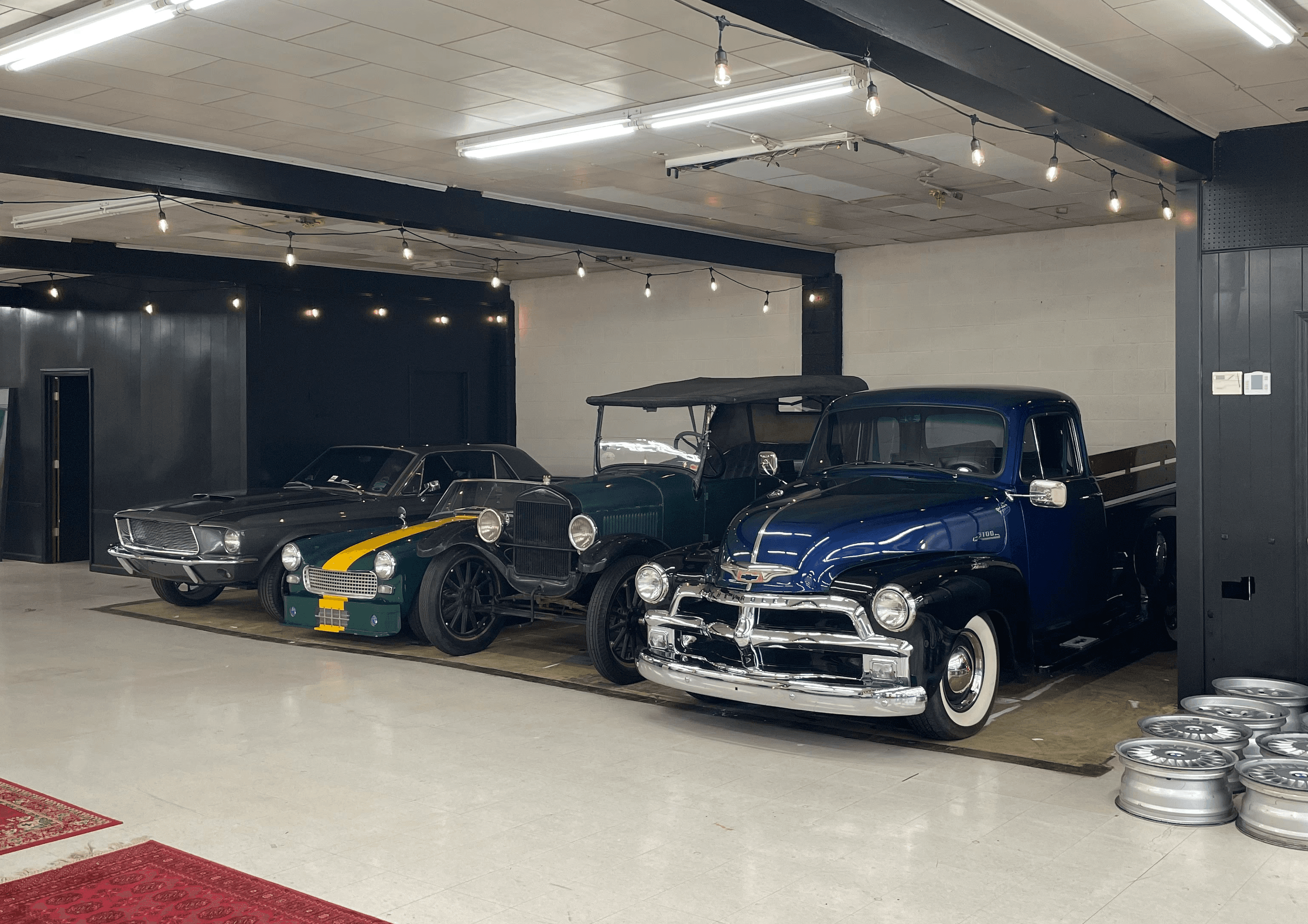 Upstairs, the main garage is clean, flexible, and fully capable — a space where vintage cars are serviced by day and sometimes celebrated by night.